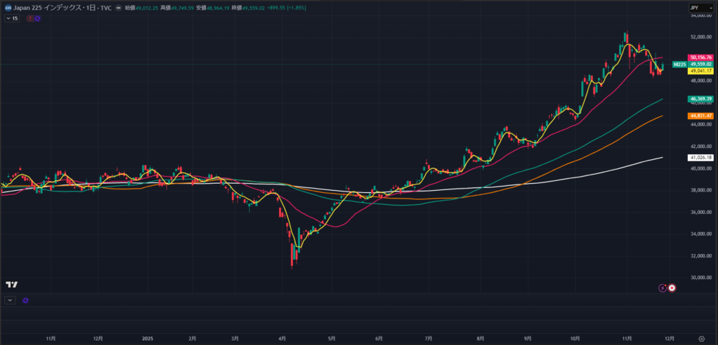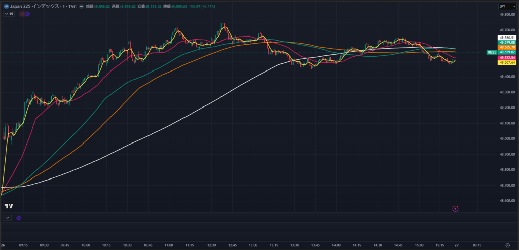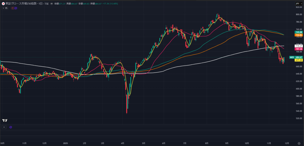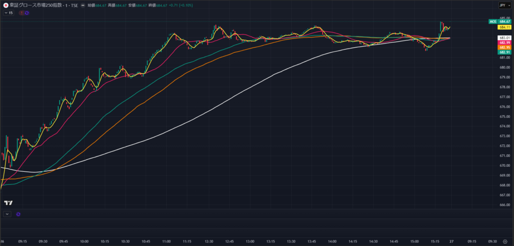日経平均・TOPIX・グロース250の日足チャートとザラ場の値動きを見てみます。