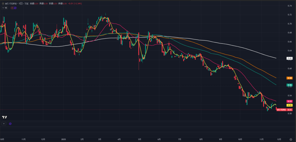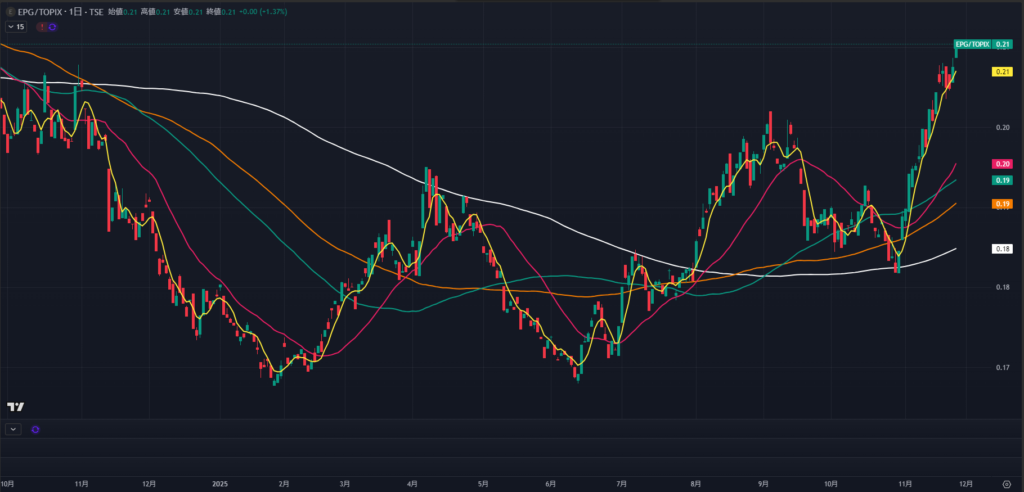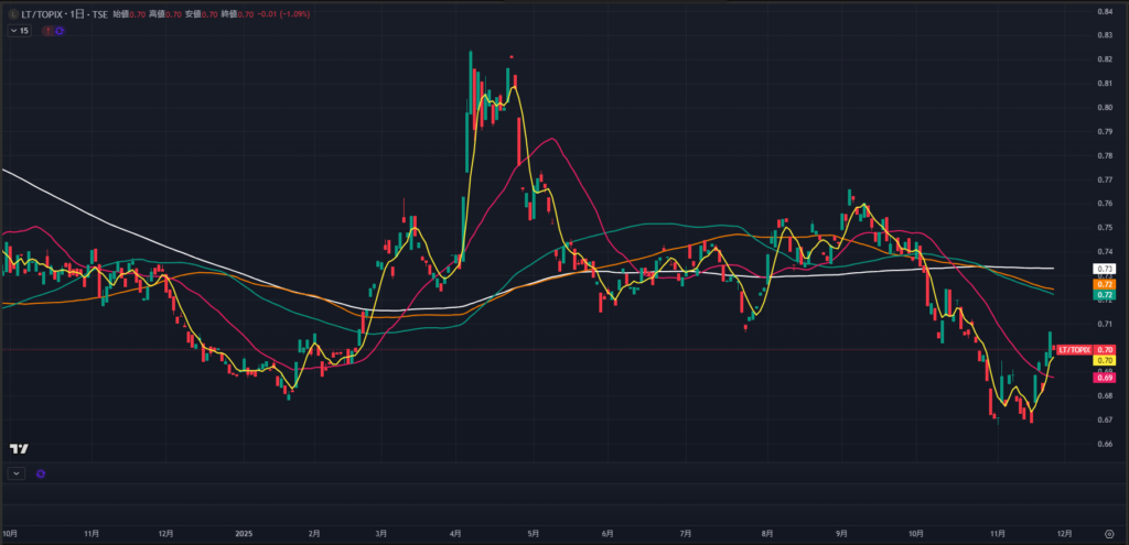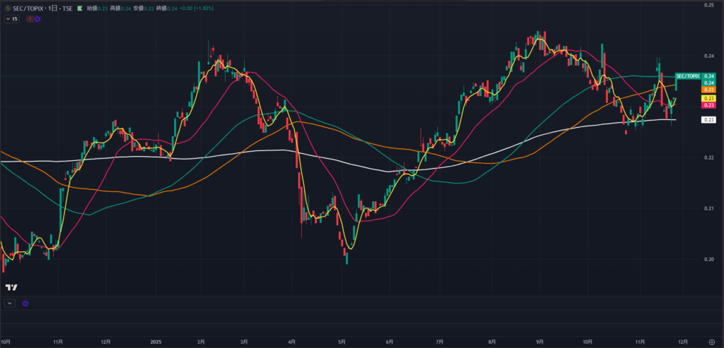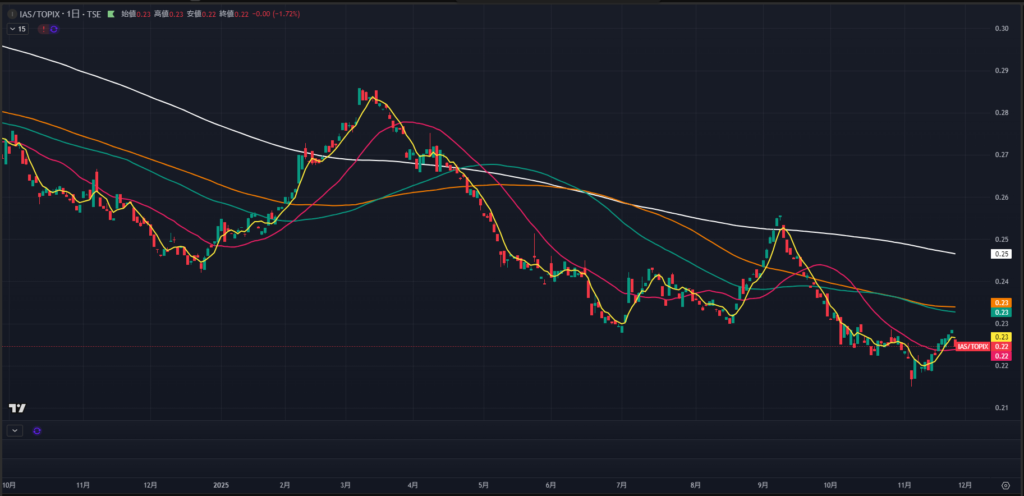 こんにちは。しんぐるです。本日11/26(水)、日経平均、TOPIX、グロース250、対TOPIX業種指数、個別株400銘柄程度のチャートチェックしていて気なった銘柄をいくつか紹介します。