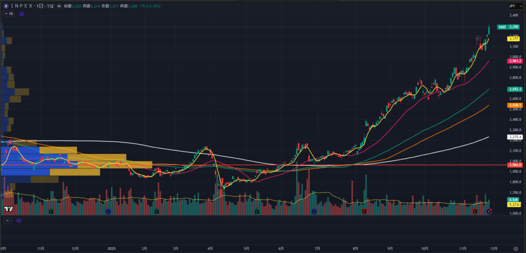 日本最大の石油・天然ガス開発企業で、国内外でエネルギー資源の探鉱・生産を行う。