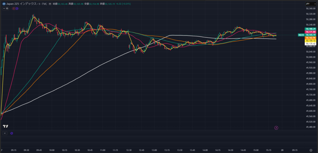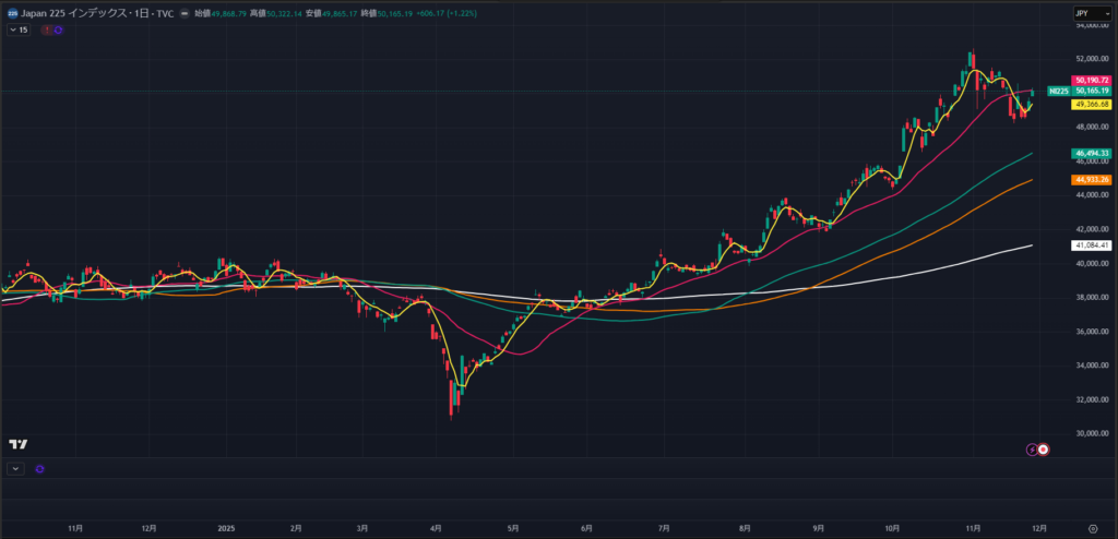 本日も日経、TOPIX、グロース3指数そろって上昇しました。日経平均は終値で50000円台回復。昨日の米国株市場はダウ、ナスダックとも上昇し、リスクオンムードが継続しました。