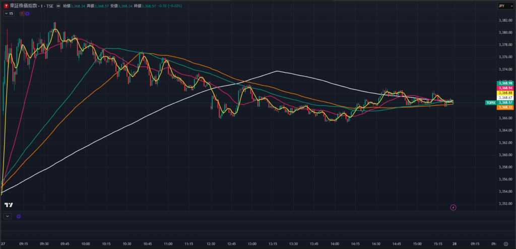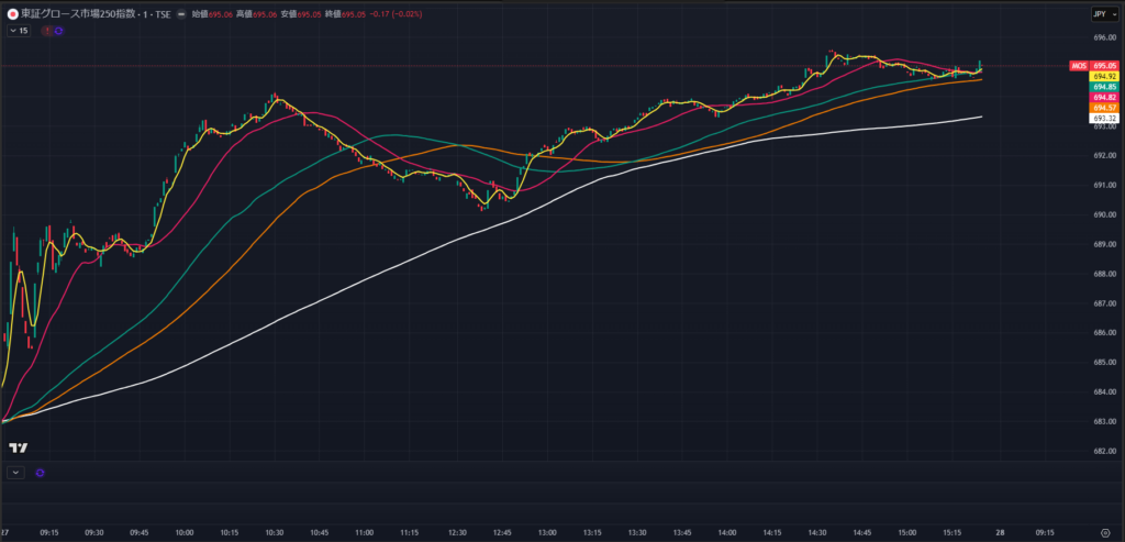 日経平均・TOPIX・グロース250の日足チャートとザラ場の値動きを見てみます。
