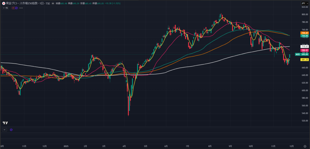 グロースも珍しく2連騰。25日線を超えれるかが注目です。