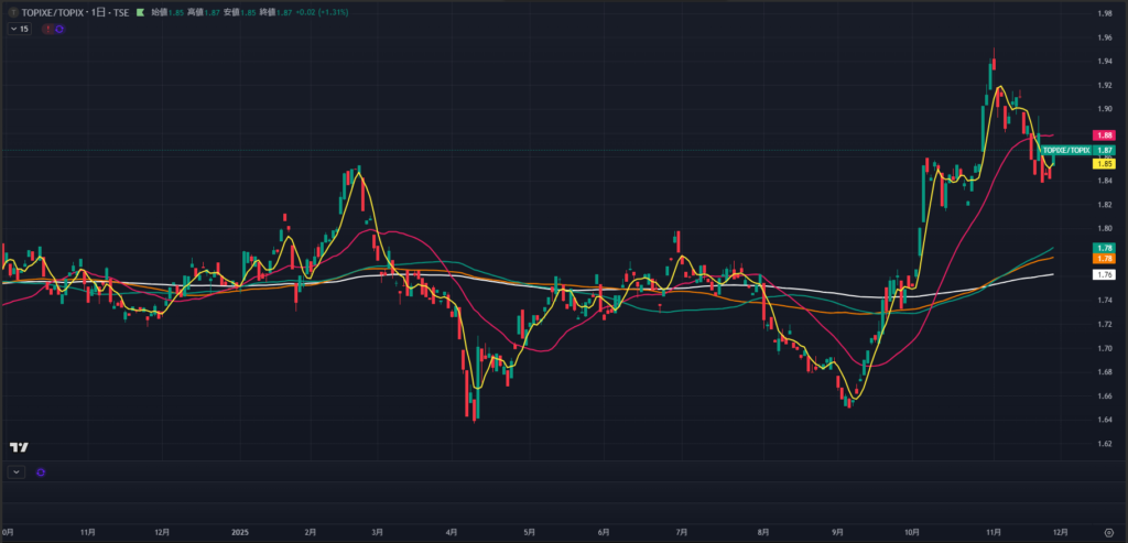TOPIXも昇。今日はハイテク中心での上昇だったので、TOPIXの上昇は控えめ。