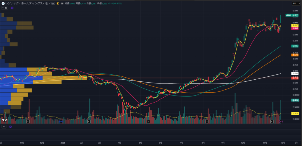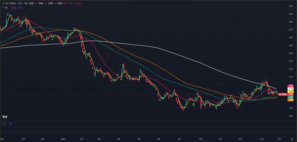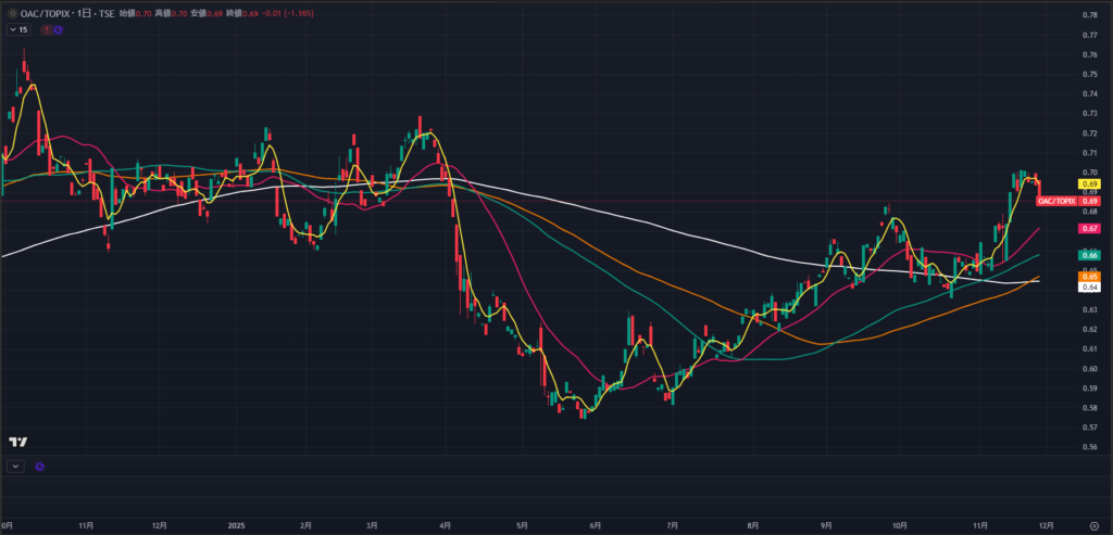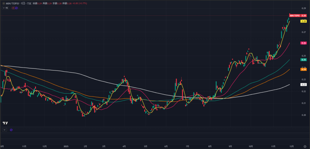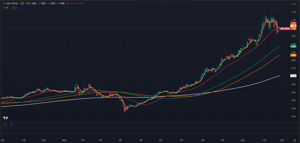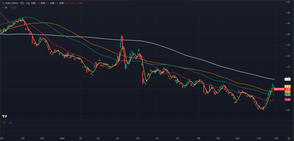 こんにちは。しんぐるです。本日11/27(木)、日経平均、TOPIX、グロース250、対TOPIX業種指数、個別株400銘柄程度のチャートチェックしていて気なった銘柄をいくつか紹介します。