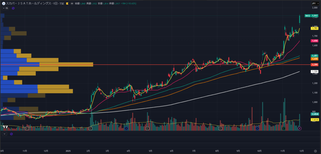 スカパー運営と、通信衛星による、宇宙・通信サービスを手掛ける企業。本日10%を超える上昇となりました。